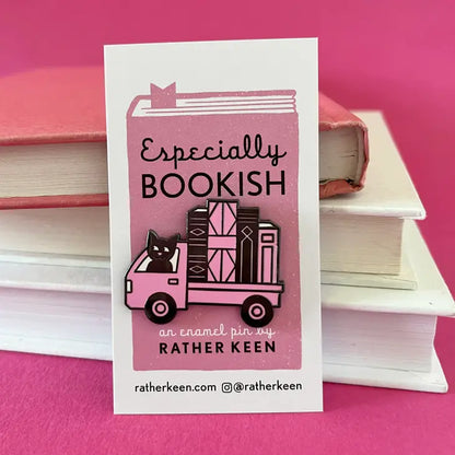 Based on the mini mid-century Japanese kei trucks. Naturally, the driver is a bookshop cat. 1.5 inch wide (38 mm), hard enamel pin. Black rubber clasp.